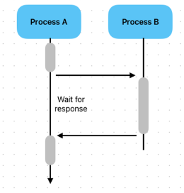 다른 작업이 진행되는 동안 자신의 작업을 처리하지 않고 (blocking), 완료 여부를 받아 순차적으로(sync) 처리하는 방식입니다. 다른 작업의 결과가 자신의 작업에 영향을 주는 경우에 사용합니다.