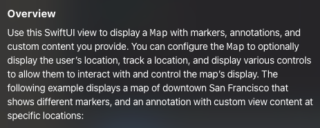 설명을 보면 SwiftUI에서는 Map을 마커나 어노테이션, 커스텀 요소들과 함께 보여줄 수 있다고 합니다.